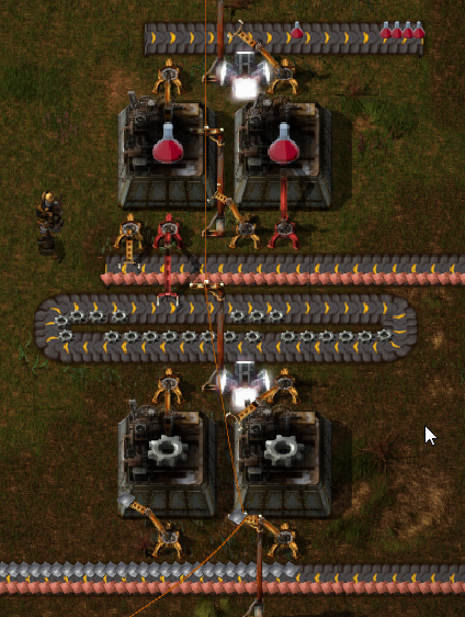 Что мы видим? Входной конвейер один, поставляет одновременно и медь и железо, промежуточный продукт производится на месте и перекладывается непосредственно в то место, где он необходим. На выходе — красные бутылки. Просто, компактно.